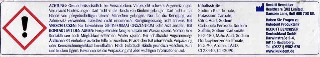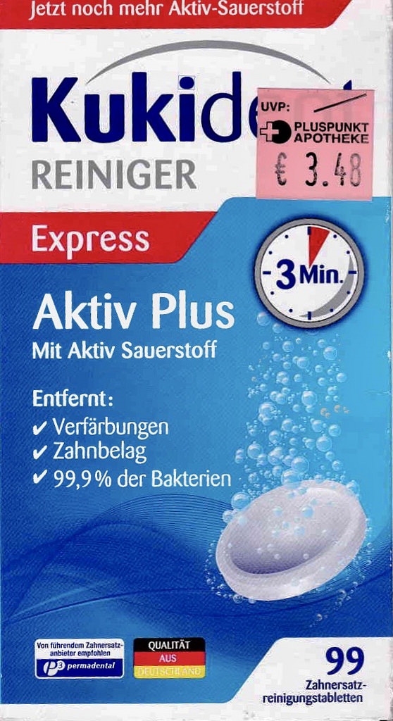 Die Ausführungen haben mich neugierig gemacht und ich habe in der Apotheke Zahnersatz-Reinigungstabletten " Kukident Express Aktiv Plus " von der Firma RECKITT BENCKISER gekauft.