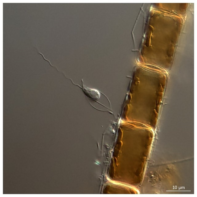 ein schönes Foto eines interessanten Flagellaten. Sich mit der Geißel im Gehäuse verankern - darauf muss man erst einmal kommen.