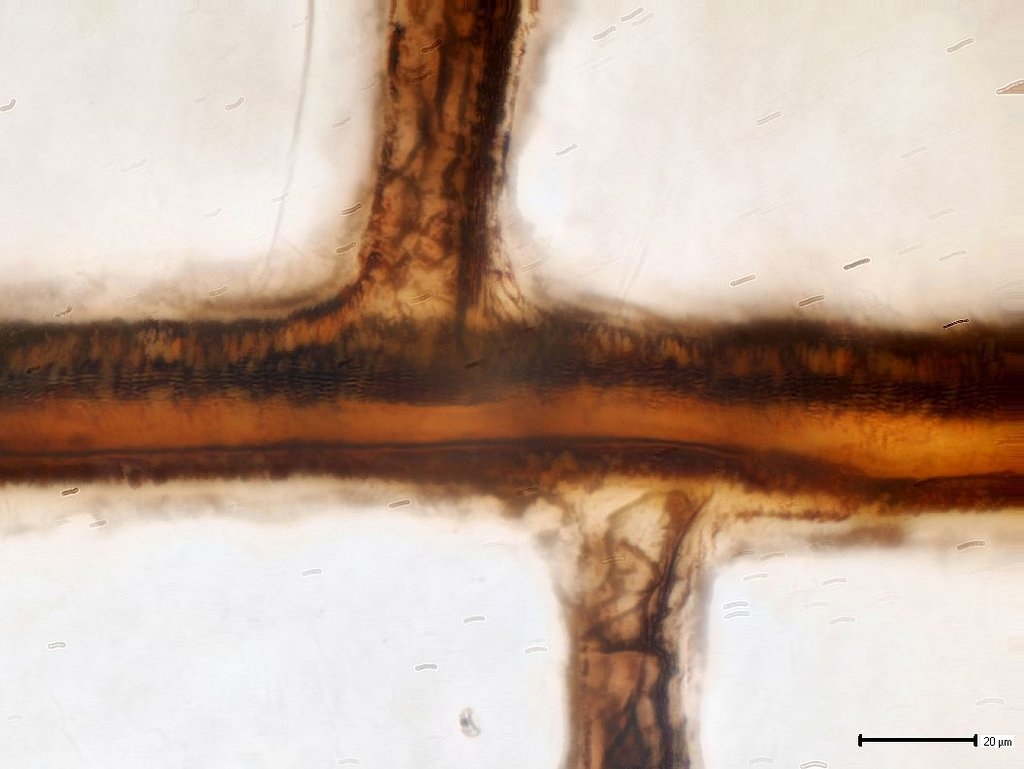 Leider lässt sich die sicherlich vorhandene Struktur, die für die Beugungsfarben verantwortlich ist, mit meinen Möglichkeiten nicht darstellen. Vermutlich auch, weil das verwendete Euparal vom Brechungsindex zu nah an dem des Chitins liegt.