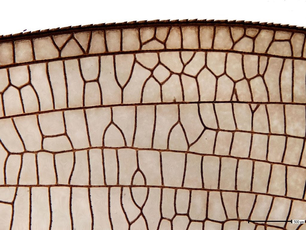 Der Flügel ist durch ein feines Netz versteift; die einzelnen Feldern werden durch eine Haut gebildet. Zumindest auf dieser müssten die erwarteten Mikrostrukturen zu sehen sein. Der Flügelrand ist besonders versteift und gezackt. Die Form dient dazu, Luftwirbel so klein wie möglich zu halten. In den "Streben" sind schon Tracheen zu erkennen, die den gesamten Flügel durchziehen.