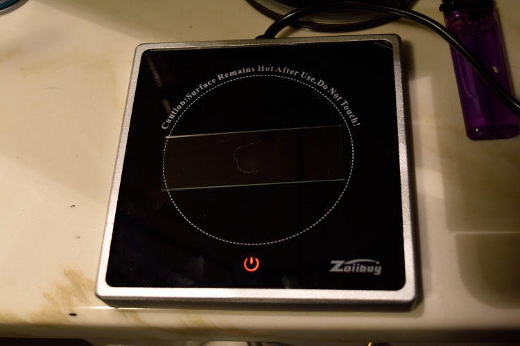 man nehme einen geputzten Objektträger, den guten chinesischen Tassenwärmer (verhindert auch das Zerspringen des Objektträgers) und pipettiere Trinkwasser in Form von 2 Tropfen auf den Objektträger.
