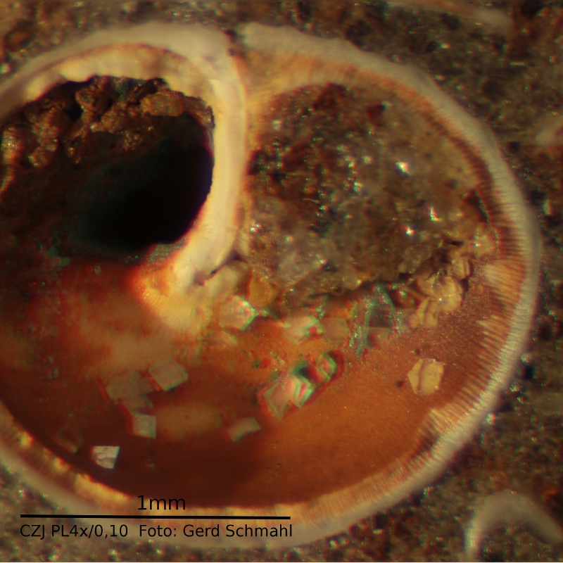 bei der Bemusterung eines angeschliffenen Turritellengesteines aus dem Tertiär (Ob. Oligozän) vom Schaalsee ist mir eine kleine Kalzithöhle aufgefallen, die ich Euch gerne zeigen möchte.