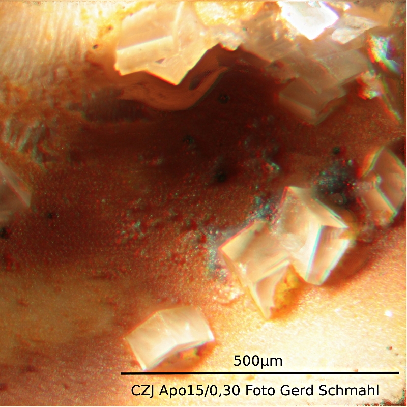 Das Gestein ist in Küstennähe entstanden. Viele der angeschnittenen Schneckenhäuser zeigen in den kleineren Windungen sogenannte "fossile Wasserwagen". Das sind Hohlräume, die nicht vollständig mit Sediment gefüllt wurden. Dien Lage des Hohlraumes kennzeichnet, wo oben war. Oft wachsen diese Hohlräume im Laufe der Diagenese mit Kristallen zu. Manchmal vollständig, aber oft nur teuilweise. In diesem Fall hat es nur für ein paar ganz winzige Kristalle gereicht. Hier ein Anaglyphenbild für die Rot-Cyan-Brille: