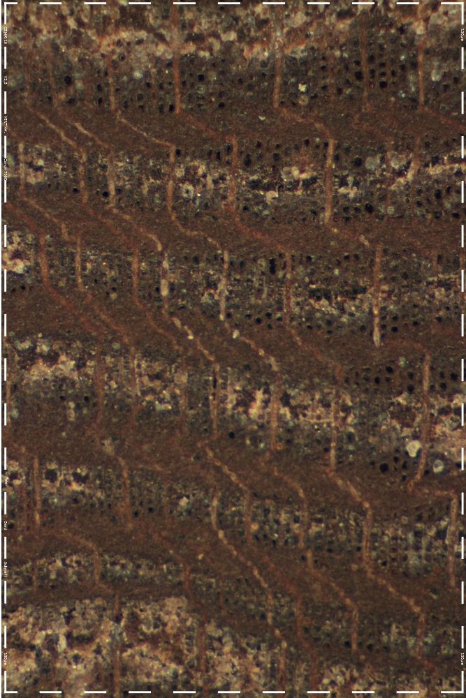 Ein weiteres interessantes Detail sind die abgeknickten Markstrahlen in den dunkleren Streifen. Ich habe wenig Erfahrung mit solchen Hölzern, könnte mir aber vorstellen, dass das offenporigere Frühholz schneller von verfestigenden Lösungen durchdrungen wurde, während das feinporigere Spätholz dem steigendem Druck der überlagerten Schichten nachgegeben hat und seitlich verdrückt wurde, bevor es ebenfalls versteinerte. Ich bin mir auch nicht ganz sicher, ob das Holz eher verkieselt oder phosphoritisiert wurde. Die dunkle Farbe deutet eher auf letzteres hin. Es war auch relativ einfach zu schleifen, viel leichter als durch und durch verkieseltes Hölzer.