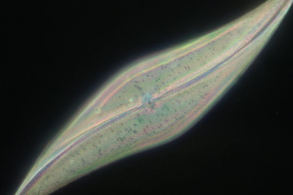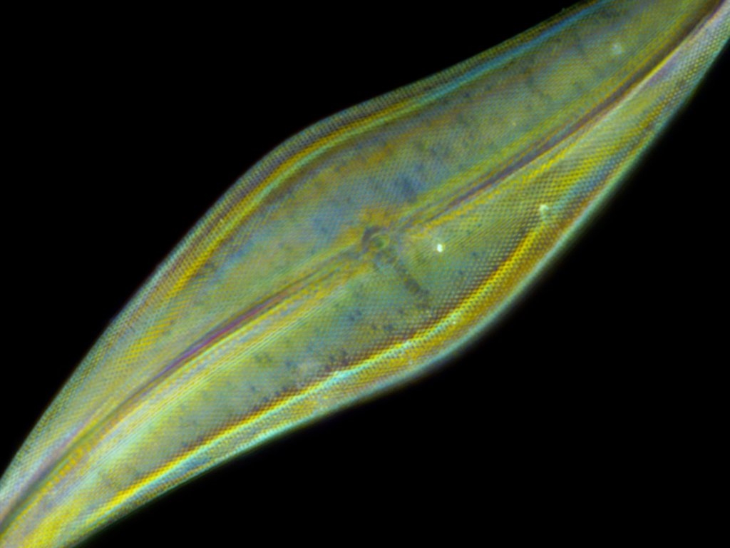 Objekt ist beides mal die selbe Diatomee ( ,,Pleurosigma angulatum") eines Präparats von Stefan Sollinger, in dem diese Art von Diatomeen selektiert wurde (Danke dafür).
