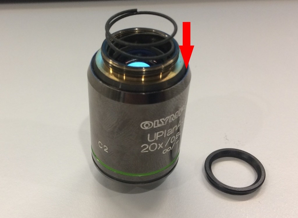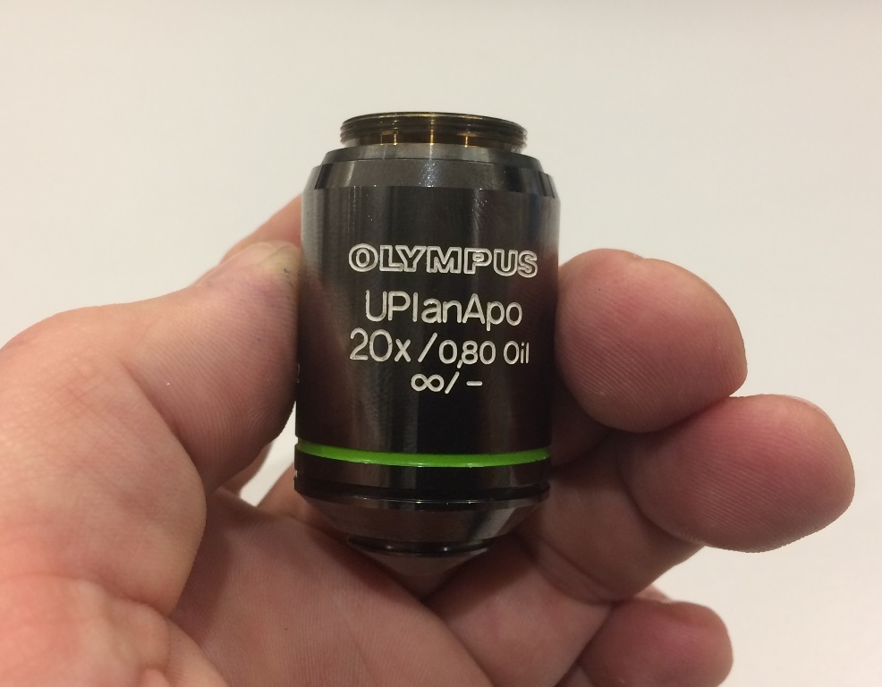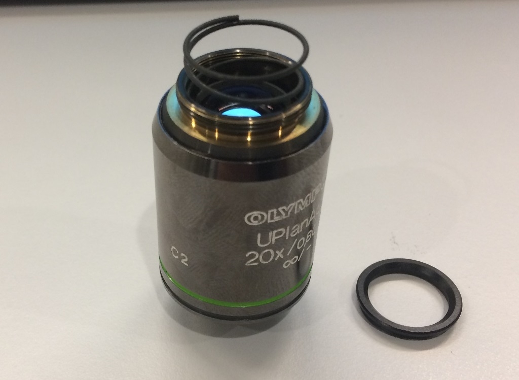 Got a hardly used 20x immersion objective at work which doesn't give a good image. Looking through it shows a bubble, I suppose that's air and the surrounding is filled with oil. So I called Olympus, asked them to repair it and they replied: sorry, no spare parts. That's bullshit of course, but the time investment and lack of proper repair facilities might make it uneconomical for them.  Anyway, I got myself something to play with.