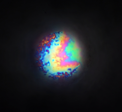 vorhin einen Nagel, habe ich diesmal wie Du ,,Auermetall" am Schleifstein traktiert und direkt einen OT ,,besputtert". Die Partikelformen sind sehr unterschiedlich. Diese Kugel mit ,,Anlauffarben" halte ich für vorzeigbar: