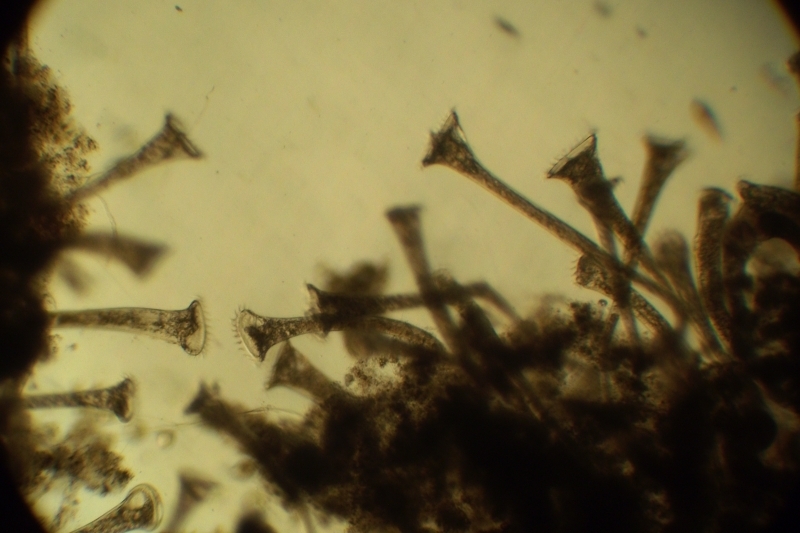 asu dem Teich an der Wasserburg in Seligenstadt habe ich eine Trompetentierkolinie isoliert und photographiert. Die Kolonie lebt auf einem Hohlschliff-Objektträger, deswegen möge man mir den einen oder anderen Mangel des Photos nachsehen. (Achromat 5x/0,12 am Jeneval)