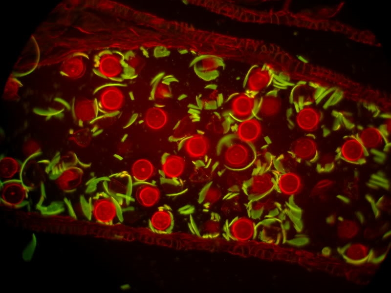 Erstaunliche Fluoreszenzaufnahmen mit Halogenleuchte und Dunkelfeldkondensor wie ich sie sonst nur nur mit superteuren Spezialeinrichtungen gesehen habe.