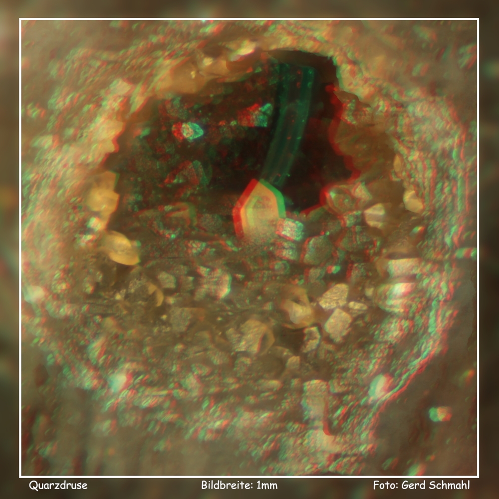 Keine Ahnung, was das Grüne über dem zentralen Quarzkristall ist. Eventuell ist es auch eine beim Schleif- und Reinigungsprozess eingespülte Verunreinigung, aber irgendwie sieht es auch kristallin aus. Und hier das Ganze nochmal für die Anaglyphenbrille. Leider sind da naturgemäß die Farben ziemlich hinüber.