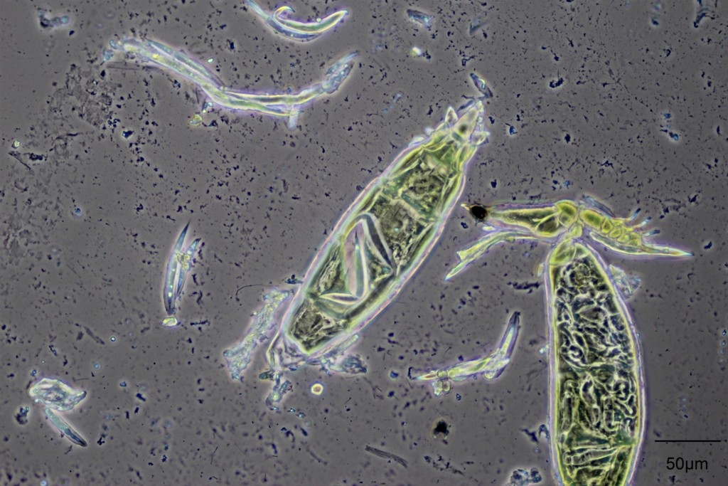 Unter Deckglasdruck treten längliche Gebilde in verschiedenen Größen aus, die sich an beiden Enden verjüngen, nachfolgend 2 Fotos im Phasenkontrast: