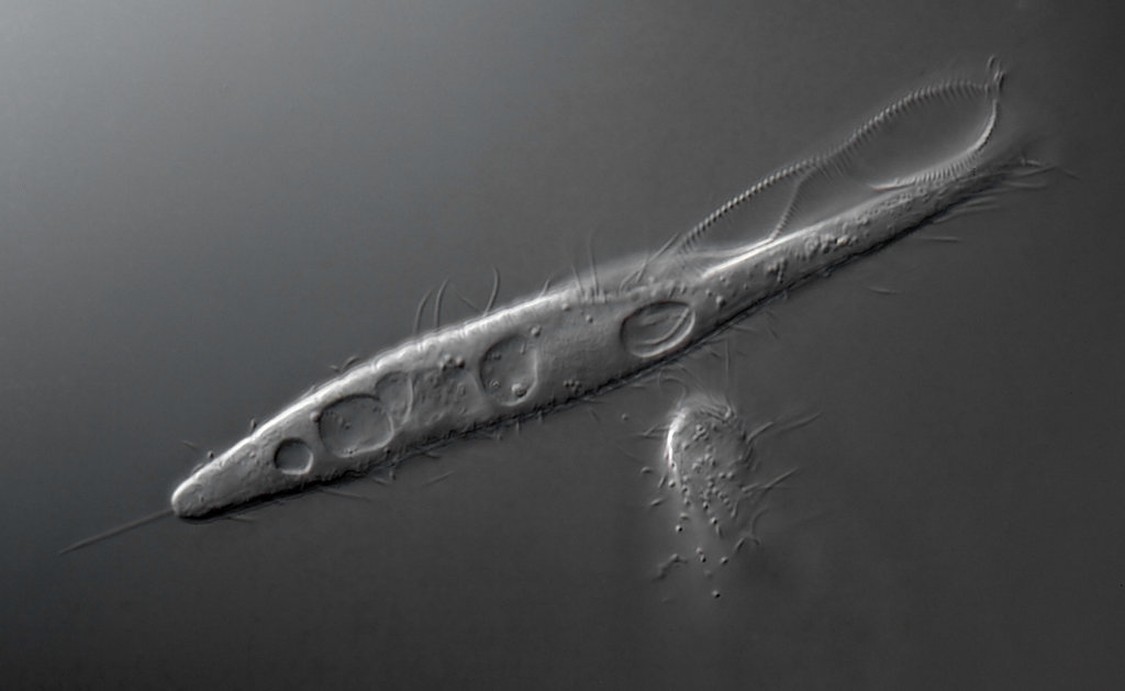 Du bezeichnest ihn in der Überschrift als Cohnilembus verminus und verweist dann auf eine Zeichnung im Wiki, die Lembus infusionum zeigt, weil beide Arten ähnlich sind?  Gary Calkins "Marine Protozoa from Woods Hole" habe ich nur ergoogelt. Er schreibt, beide Arten verfügten über die caudale Borste, würden sich aber darin unterscheiden, dass C.verminus über einen doppelten Nukleus verfüge, C infusionum hingegen nicht. Außerdem besitze C. infusionum im Unterschied zu C verminus viele  Vakuolen (wie offensichtlich in Deinem Bild).