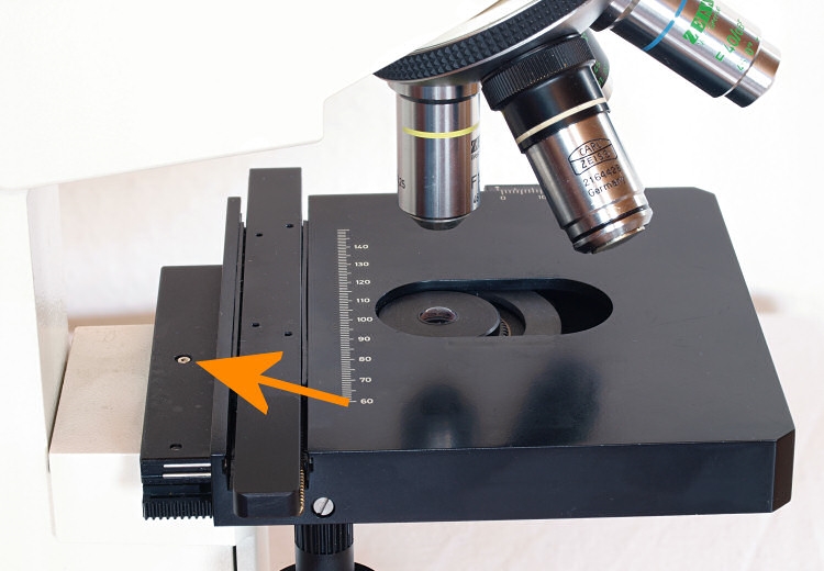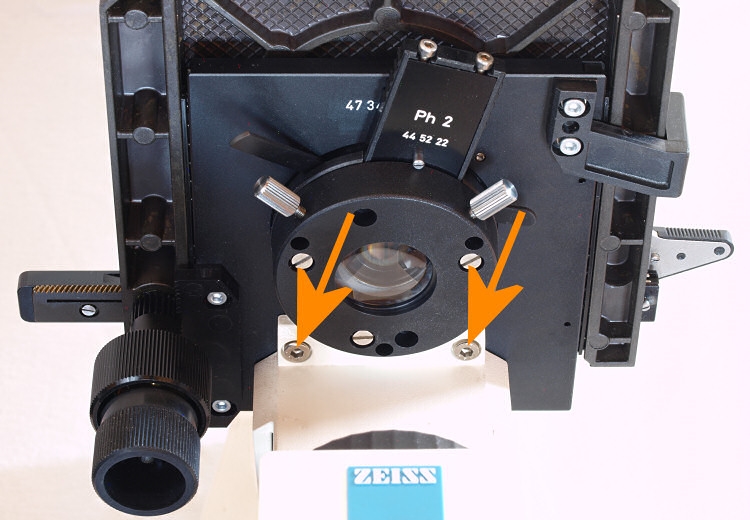 Heute hatte ich versucht, den Kreuztisch zu demontieren. Leider scheitere ich schon beim Abbau vom Stativ. Der KT ist von unten mit zwei Schrauben arretiert, die ich problemlos mit einem Inbusschlüssel lösen konnte: