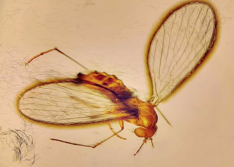 bei einer Haushaltsauflösung wurden mir zwei Bernsteine in die Hand gedrückt nach dem Motto: "Du sammelst doch Fossilien." In einem dieser Bernsteine unbekannter Herkunft fand ich zwei winzige Insekten. Diese auch nur eineigermaßen ordentlich ins Bild zu bekommen, stellte sich als größere Herausforderung dar.