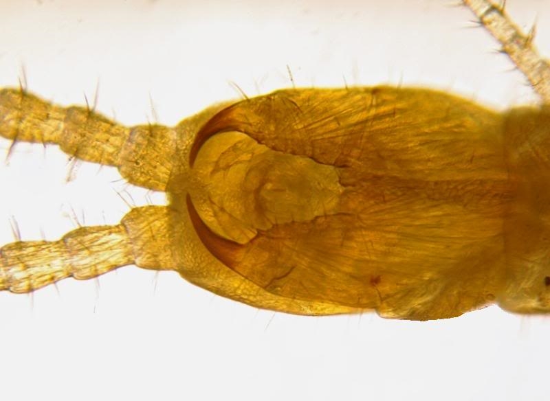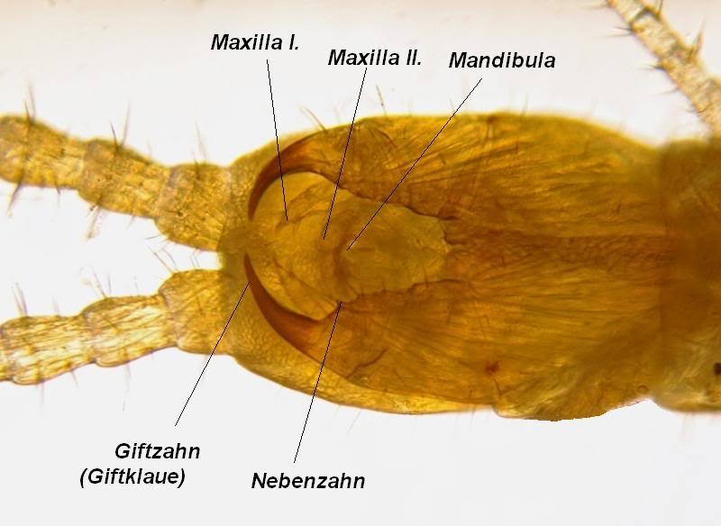 Falls jemand ein solches Erdläufer bestimmen möchte: Schendylidae sind klein, gelbisch, haben 2-2 Poren an Seiten-Coxae von dem letzten Laufbeinpaar (Bild 3). S. montana hat neben dem Giftzahn medial ein Neben-Zahn (Bild 2). Es hat kein Poren-Feld an Bauchseite des Körpers (Bild 4).