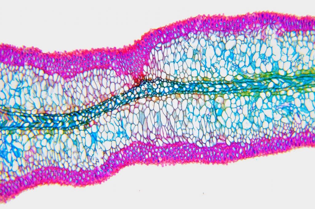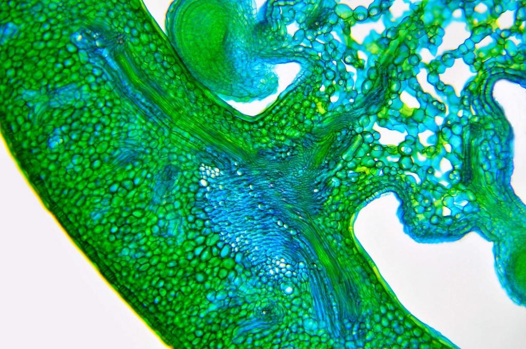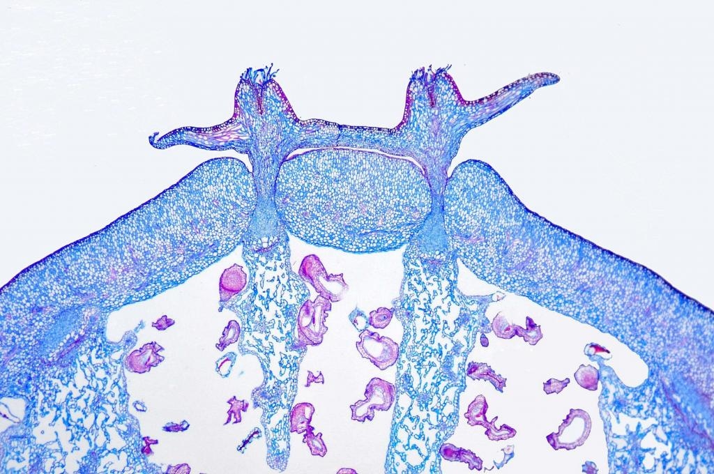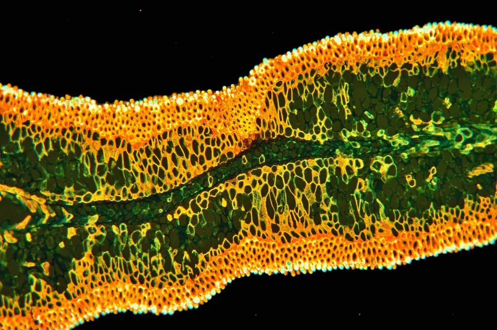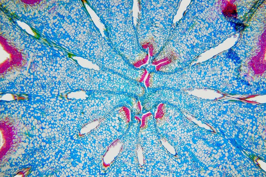 Verholzte Zellwände leuchtend rot, unverholzte Zellwände intensiv blau. kutinisierte Membranen dunkel braunrot