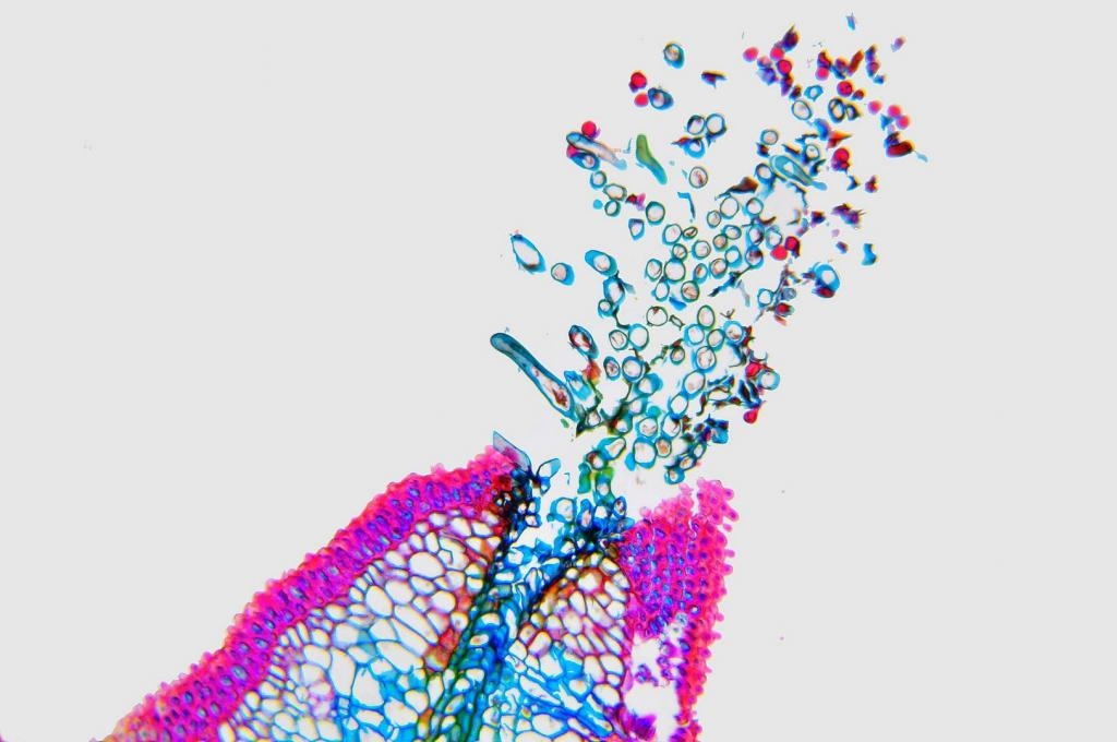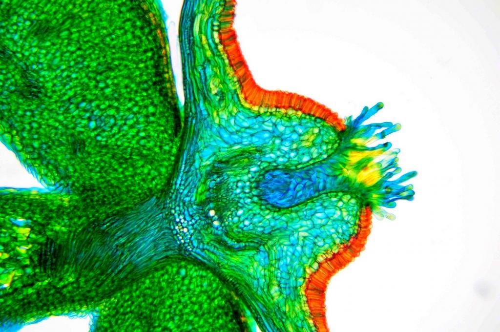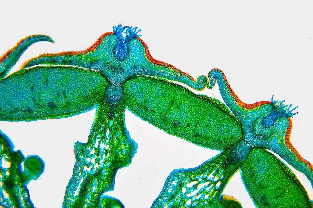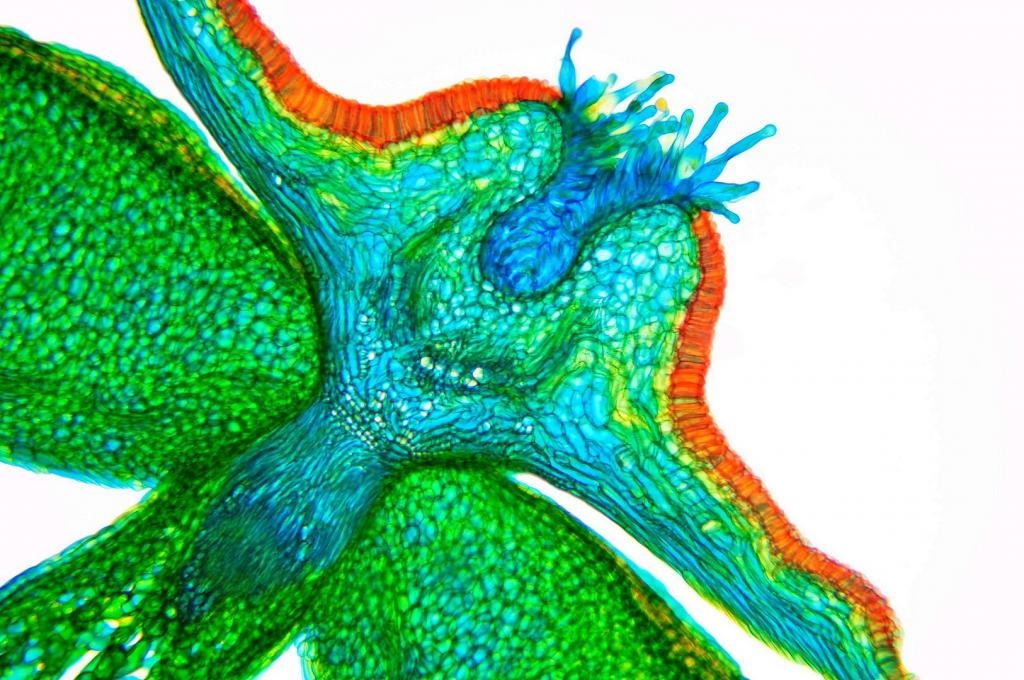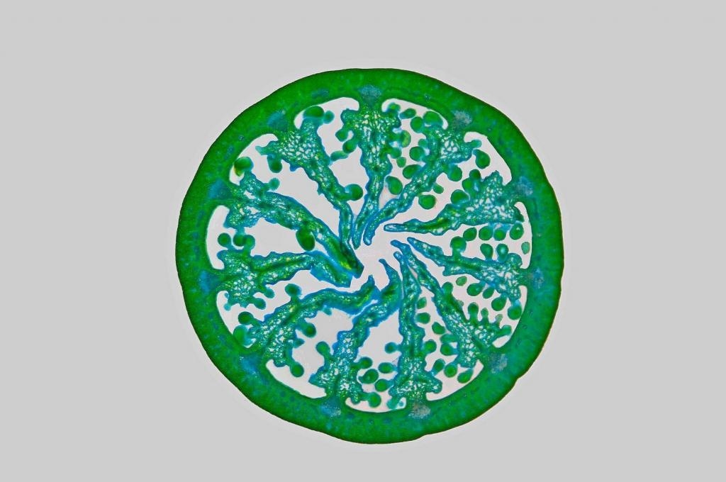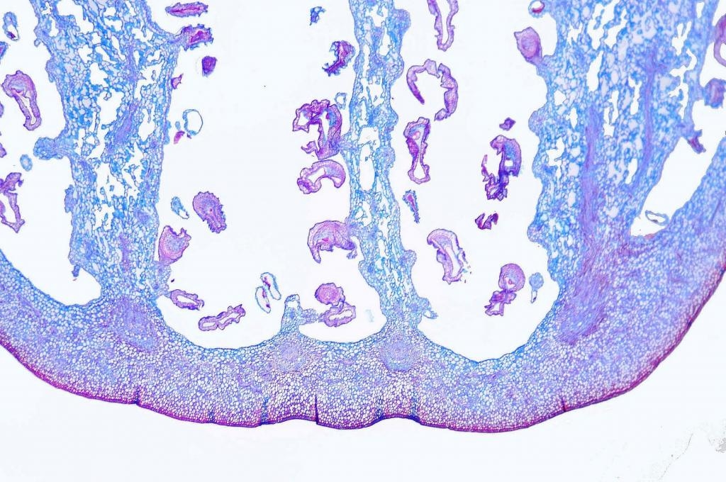 Verholzte Zellwände leuchtend rot, unverholzte Zellwände intensiv blau. kutinisierte Membranen dunkel braunrot
