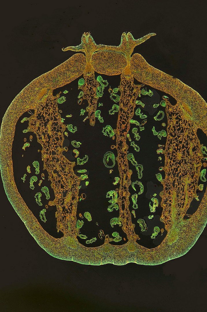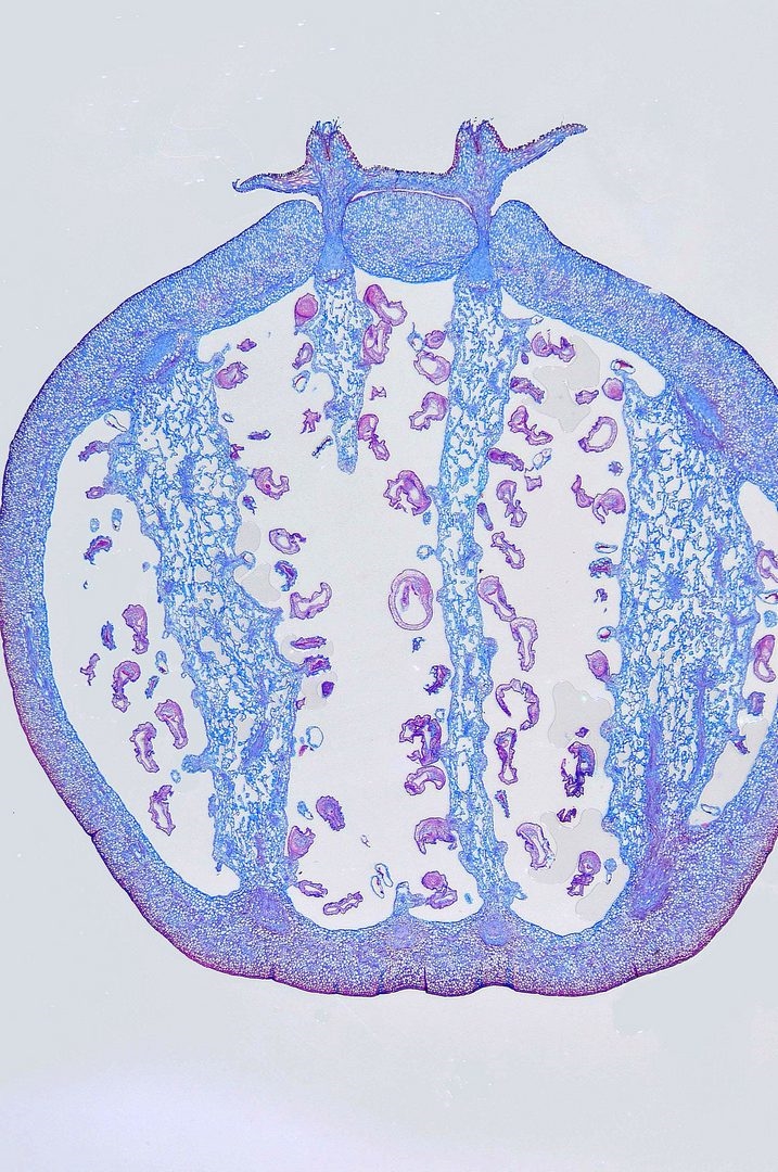 Stellt man durch die Frucht einen Längsschnitt her, so sieht man, dass ihr Innenraum durch Scheidewände, die aber in der Mitte nicht zusammenstoßen, in mehrere Kammern geteilt ist.