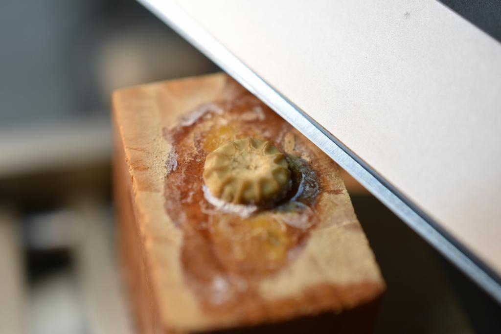 Bild 15 Schnittprobe auf einen Holzklotz geklebt.