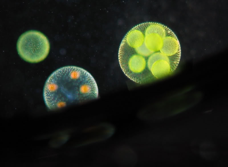 eigentlich wollte ich heute ein Video von meinen geliebten Volvox-Kugeln aufnehmen, es ist mir leider noch nicht gut gelungen, wird aber nachgeliefert. Nebenbei entstand dieses Bild am Rand des Deckglases mit einem ganz schönen Effekt.