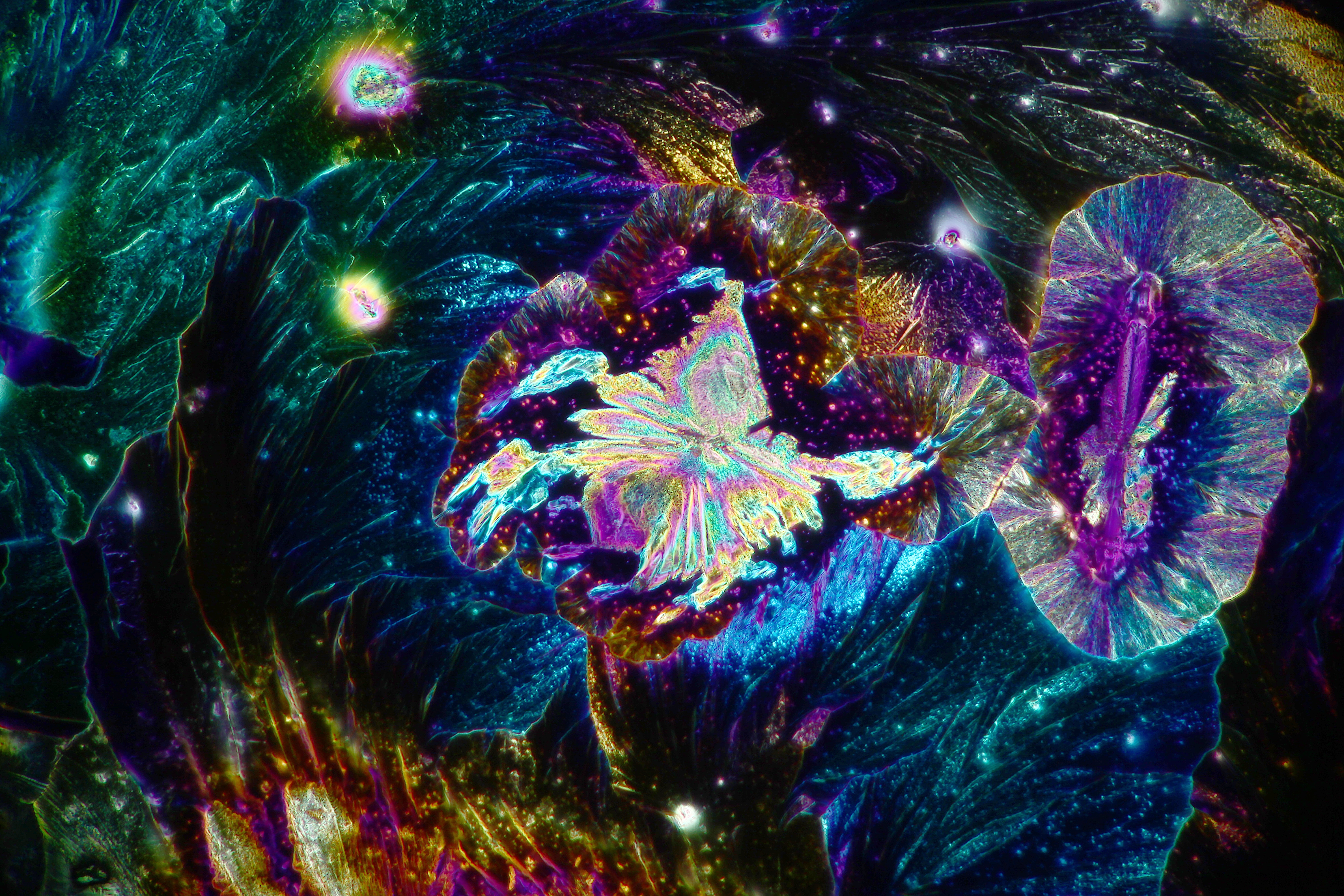 Hier präsentiere ich Ihnen zwei gebräuchliche Haushaltschemikalien: Zitronensäure und Paracetamol. Beides sind Einzelaufnahmen mit einer Leits Planapo 6,3 / 0,2 (Rohrlänge 170 mm), die auf Zeiss Phomi III montiert ist. Für die Zitronensäure wurde der Kondensator leicht von der Achse weg gedreht, um eine schräge Beleuchtung zu erzeugen. Für den Paracetamol-Schuss habe ich den Ph2-Ring als Dunkelfeld-Stopp verwendet.