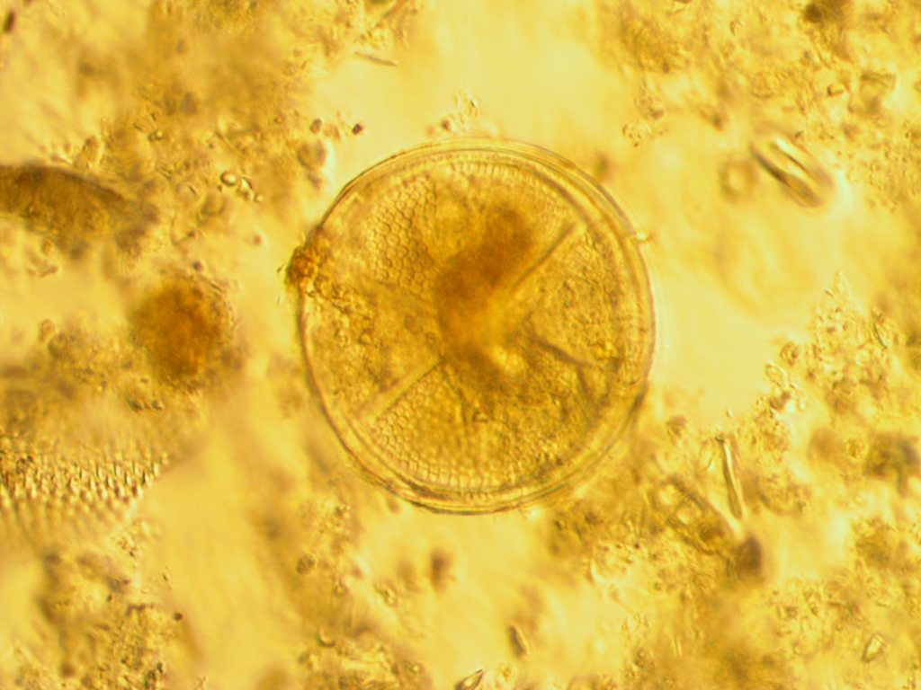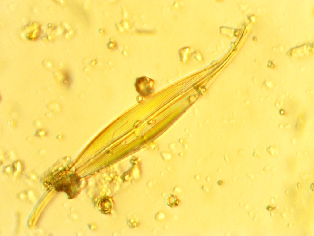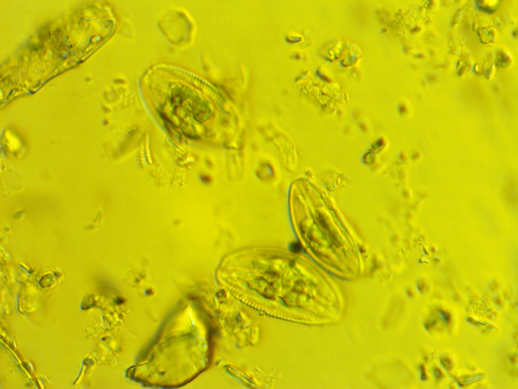 Meine Bemühungen, die Agglomerate von ,,Mikro"-Diatomeen mit vermutlich feinen Tonmineralien  zu knacken, zeigen ,,erste Früchte". Aus einer Probe von ca. 0,5 g feuchtem (gesättigte Salzlösung) Watt-Schlick konnte ich nach mehrfachem Auswaschen des Salzes (mit ca. 10 ml dest. Wasser aufschwemmen, Feststoffe abzentrifugieren (2 min bei >= 3000 g), klaren Überstand verwerfen und Vorgang noch 2x wiederholen) jetzt auch die sehr kleinen Diatomeen ohne anhaftendes Feinmaterial gewinnen. Dazu habe ich lediglich den zentrifugal  gewonnenen Niederschlag mit einigen mg reine Zitronensäure versetzt und beides wiederum in 10 ml dest. Wasser aufgeschwemmt und langsam sedimentieren lassen (über Nacht). In der Sediment-Oberschicht waren dann viele Klein-Diatomeen mit ,,Innereien".