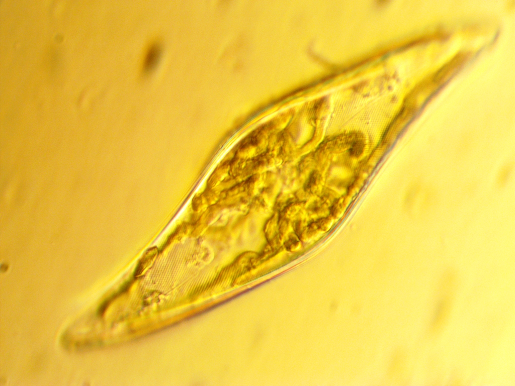 Hierzu  einige Bilder. Die Diatomeen sind ca. 20 mm groß.  M.E. ist deutlich erkennbar, dass in allen der sechs erkennbaren Diatomeen die ,,Innereien" noch vorhanden sind. Die ,,Konservierung" mit Kochsalz ,,funktioniert" also.