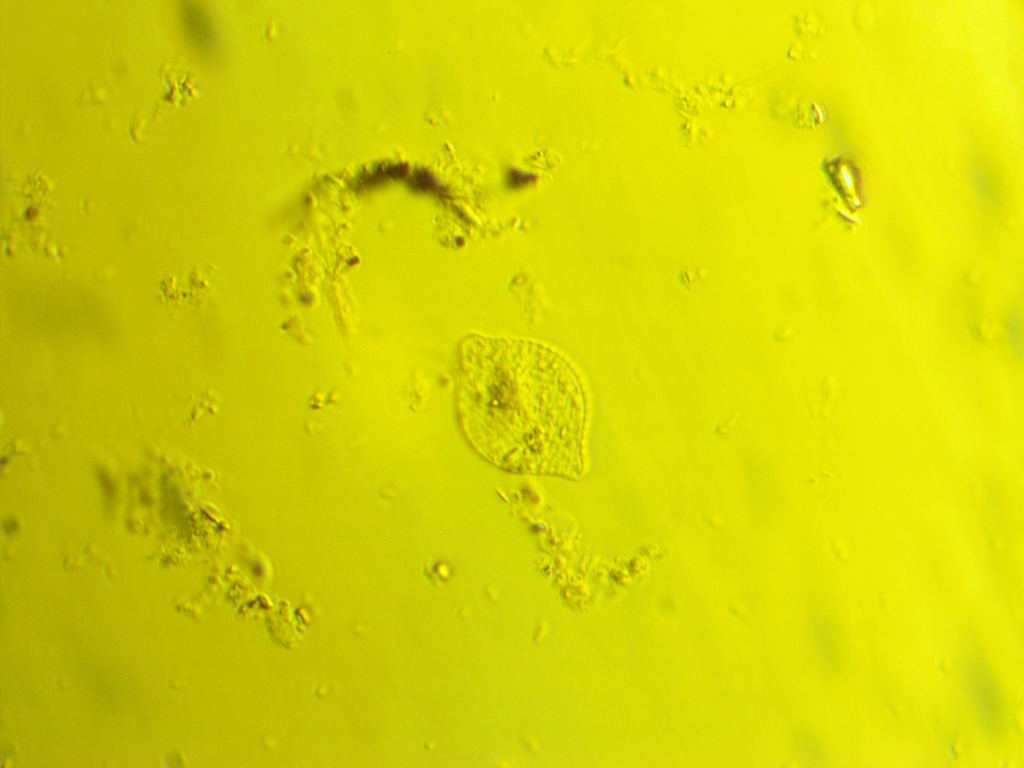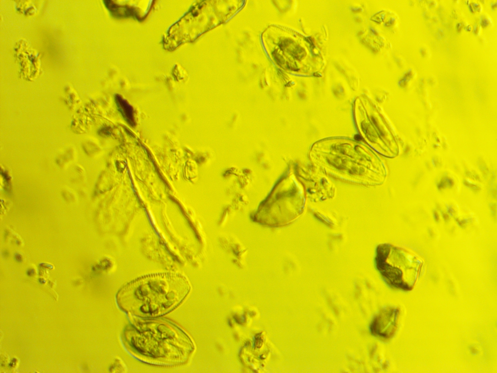 2.   Wie erwartet, enthält der Schlick sehr viele, in Form und Größe unterschiedliche Diatomeen. Aus einer Probe von ca. 1 g feuchtem Schlick konnten nach Aufschlämmen in 10 ml Wasser (zweimal mit 5 ml und kurzer Absetzzeit von ca. 5 sec, zur Abtrennung von Sand) In einem Tropfen des Überstands ca. 10 bis 20 unterschiedliche, größere Diatomeen (trotz vieler Feinpartikel) unter dem Mikroskop erkannt werden. (Sehr kleine Diatomeen sind schwer erkennbar, man findet sie in den Feinpartikeln erst mit höherer Vergrößerung (25-fach bzw. 40-fach Objektiv).