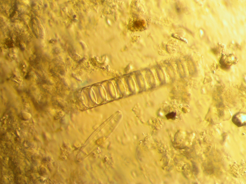 Daneben waren  viele, kleine Bruchstücke von Diatomeen-Schalen unterschiedlichster Art vorhanden. Offensichtlich werden diese sehr schnell in der oberen Watt-Schlick-Schicht von grobem Sediment zermahlen.
