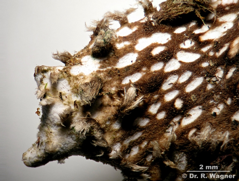 - Unterseite. Hell, mit flachen, zusammenfließenden braunschwarzen Adern. Dazwischen helle Inseln. Rhizinen braunschwarz, büschelig.