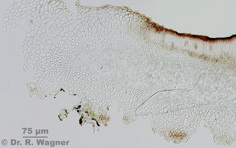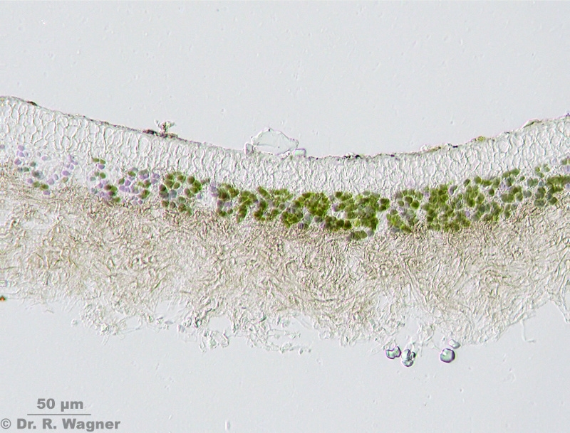 - Querschnitt Lobe. Pseudoparenchymatische Oberinde, Unterrinde fehlt, Photobiont Nostoc.