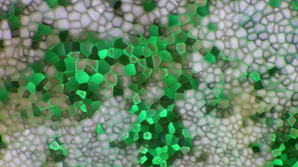 wer kann diese einfache Frage (?) beantworten: Es handelt sich um eine Auflichtaufnahme (ca. 40x) der Rückseite eines antiken Perlmuttschmuckstücks (7. Jahrhundert). Welche Bedeutung haben die wabenartigen Strukturen links oben? Ist das die normale Rückseite bei Perlmutt oder der Rest einer anderen Struktur?