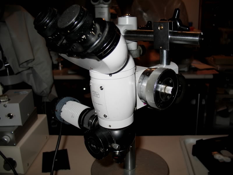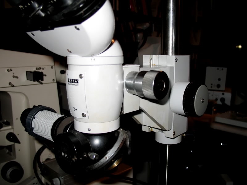 mit den Sachen im oberen Bild kann ich wenig anfangen, aber auf dem unteren Foto ist ein Tubuskopf vom Epi-Mikroskop montiert. Aber frag mich nicht, warum die beiden Triebe in zwei Etagen angeordnet sind. Das muß ein ziemlich monströser Aufbau gewesen sein.