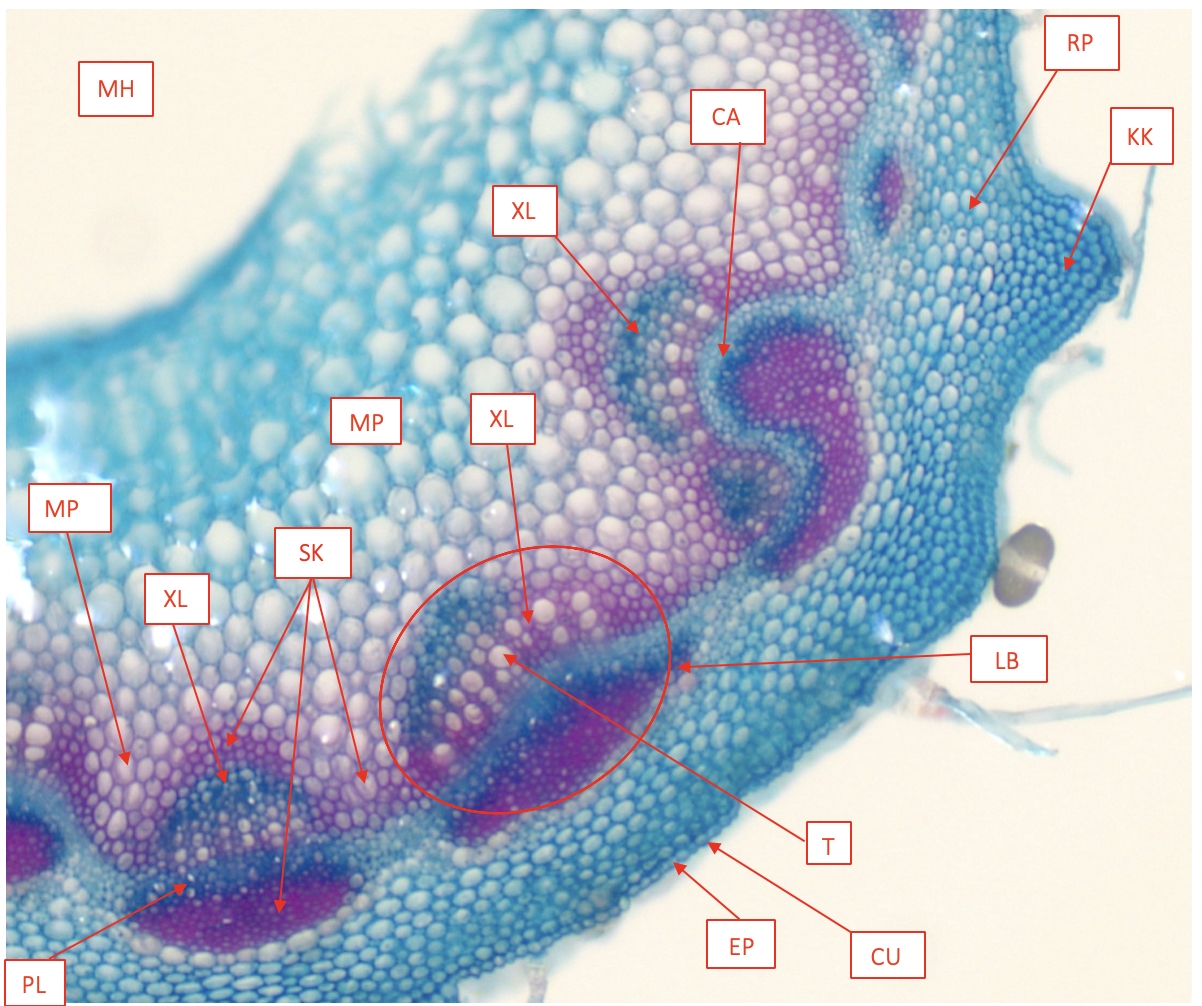 Jörg hat alles korrekt kommentiert. Es handelt sich offenbar, soweit ich das an den Fotos erkennen kann, um bikollaterale Leitbündel, bei denen es innerhalb des Xylems ein weiteres Phloem gibt. Daher die etwas konfis wirkenden Wechsel von Rot und blau. Jedenfalls handelt es sich bei der verwendeten Färbemethode bei rotem Gewebe um Lignin-haltiges Xylem, das blau bedeutet u. a. Ka,bium und Phloem, also Zellulose.