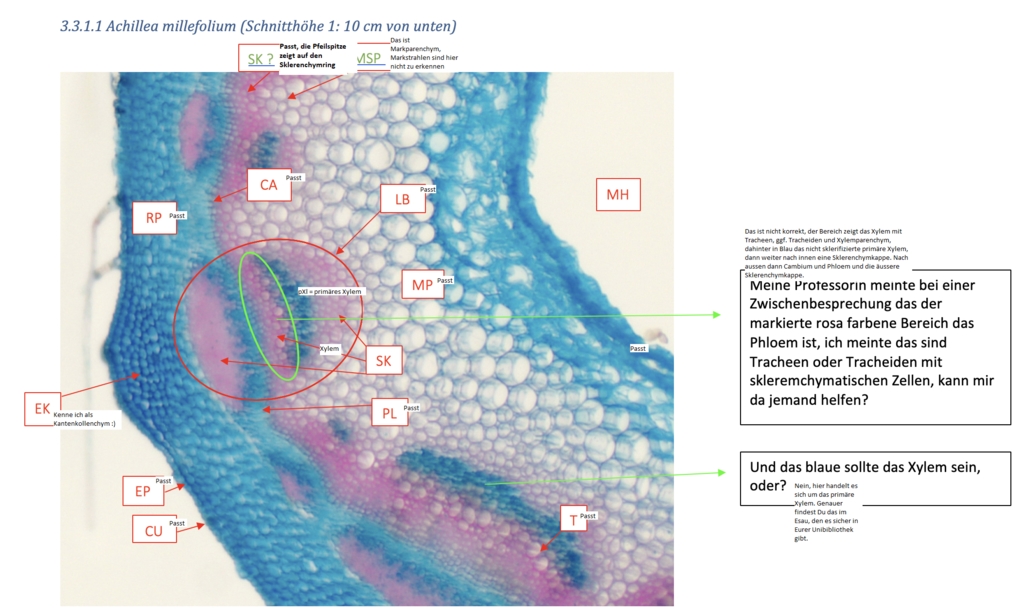Kurz und knapp: soweit alles korrekt, die Anmerkung Deiner Professorin zum Xylem / Phloem ist nicht korrekt, die blauen Zellen "hinter" dem Xylem sind primäres Xylem, Markstrahlen sind auf Deinen Bildern nicht zu erkennen, das MSP ist also auch MP und im letzten Bild hast Du Cuticula und Cambium vertauscht. Mit den Beschriftungen kannst Du dann auch die anderen Bilder korrigieren.