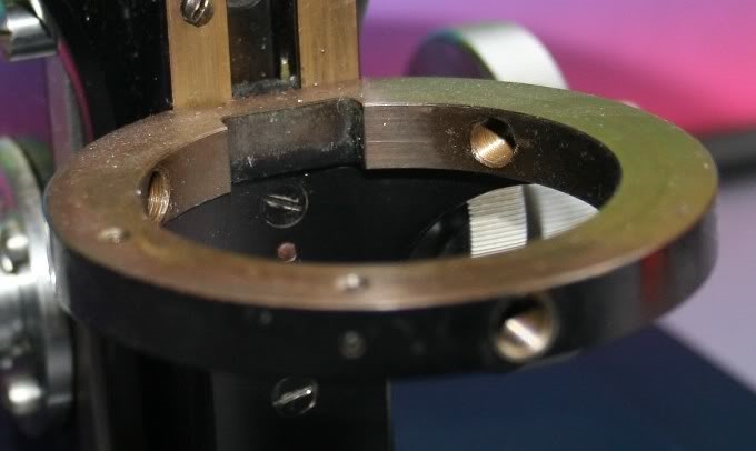 Zu sehen ist der Kondensorträger vom GFL-Stativ mit der nötigen Aussparung für den Frontlinsen-Stellhebel.