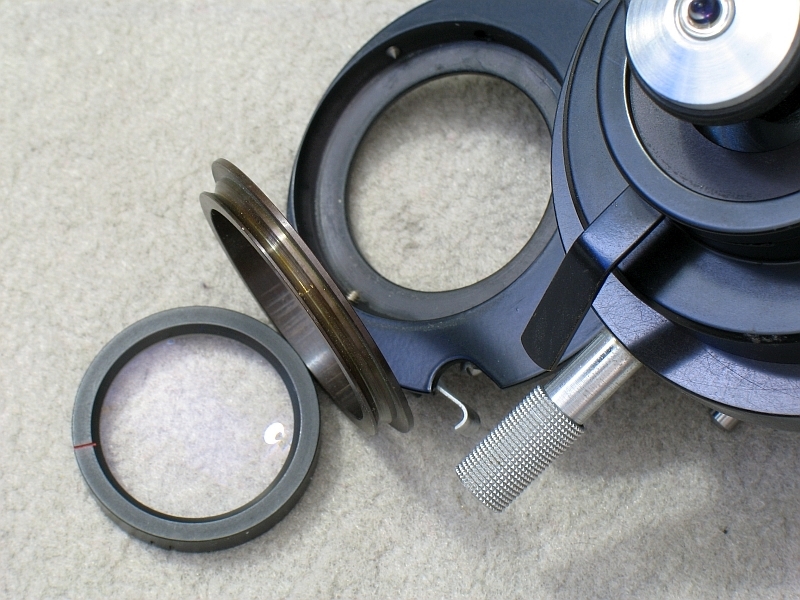 Die winzigen Bohrungen mit den M1,5-Madenschräubchen hatte ich als reine Befestigung der Hilfslinse gedeutet, aber wie ich gerade ausprobiert habe, könnte ich damit tatsächlich (allerdings seeehr fummelig) auch eine Hilfslinse zentrieren – die aber leider fehlt.
