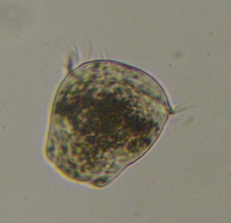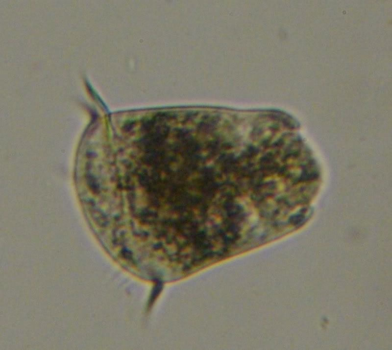 es handelt sich um das Schwärmestadium eines peritrichen Ciliaten, möglicherweise Vorticella. Für eine genauere Bestimmung wären Aufnahmen hilfreich, auf denen der Zellkern zu erkennen ist.