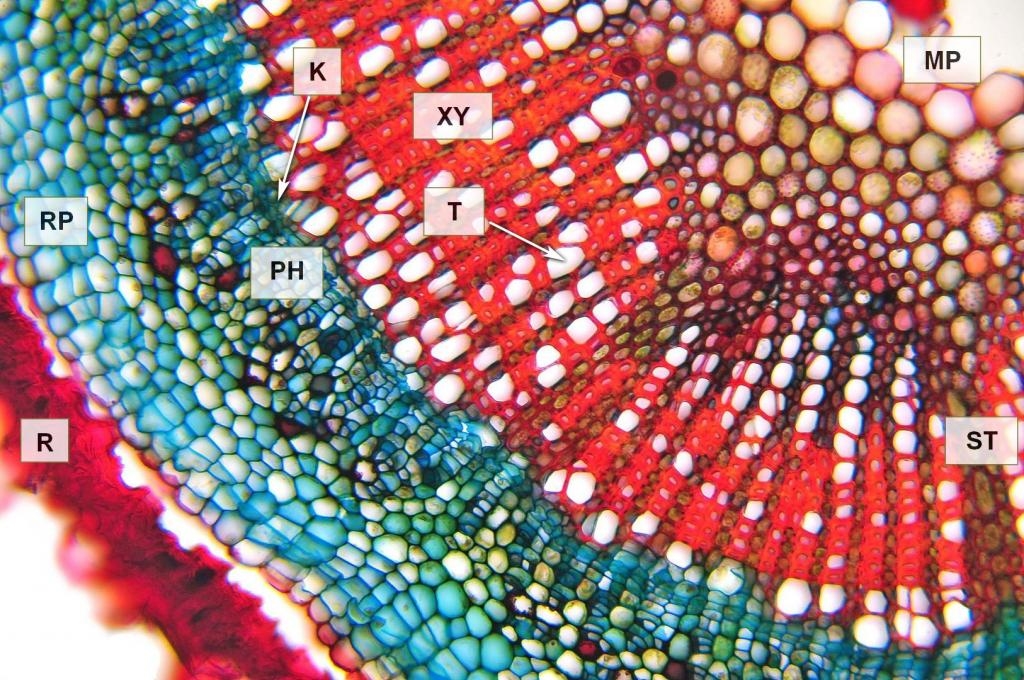 R = Rinde, RP = Rindenparenchym, PH = Phloem, K = Kambium, XY = Xylem, MP = Markparenchym, St = Strahl, T = Trachee