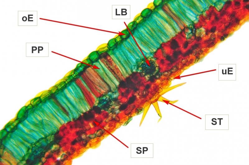 oE = obere Epidermis, PP = zweischichtiges Palisadenparenchym, LB = Leitbündel, SP = Schwammparenchym, ST = Sternhaar, uE = untere Epidermis