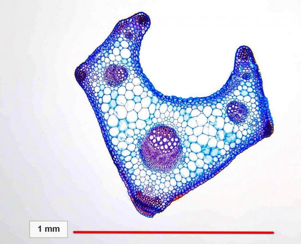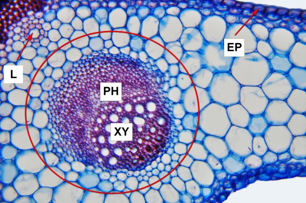 Leitbündel (roter Kreis), L = Lumen (Hohlraum), PH = Phloem, XY = Xylem, EP = Epidermis