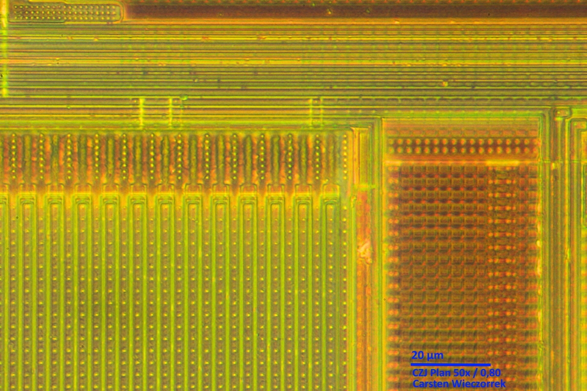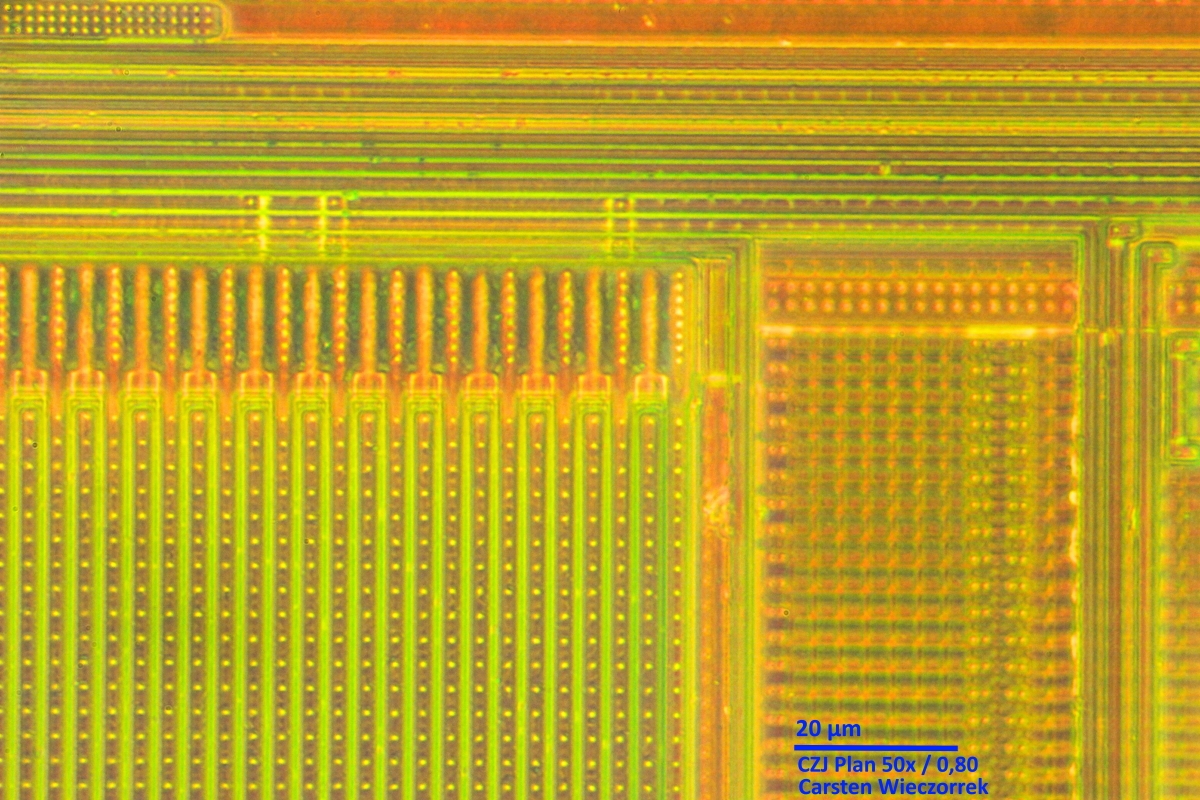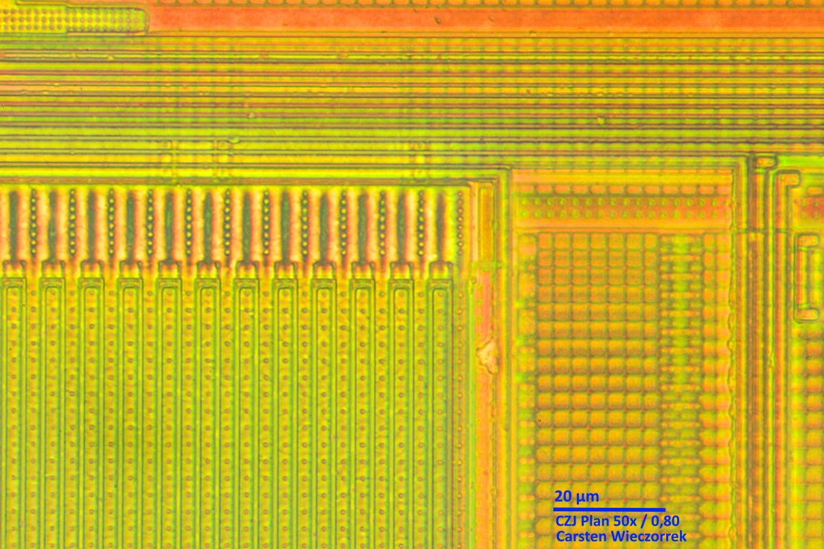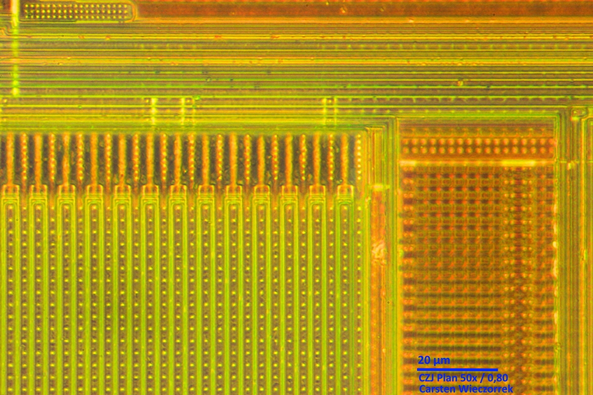 Da das Interphako-Mikroskop ja so konstruiert ist, das man grundsätzlich alle Verfahren, die im Durchlicht funktionieren, auch im Auflicht anwenden kann, wollte ich das mal ausprobieren. Da ja jetzt alles justiert ist und funktioniert - den Kontrasttubus habe ich ja schon mal vorgestellt - wird es Zeit, das auch im Auflicht auszuprobieren. Mikrochips habe ich ja genug. Das schöne an dem Mikroskop ist ja, dass man für das ganze nichts umbauen muss. Ist ja alles dran. Durchlichtlampe aus, Auflichtlampe an, Auflicht-Ringblendenschieber rein. Fertig.