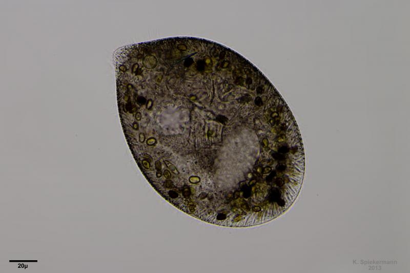 Kurz und gut: Ohne die Fragen nach den symbiotischen Algen (keine verschlungenen Diatomee, die gelten nicht) und der Lage des Oralapparats geklärt zu haben, möchte ich mich nicht festlegen. Wenn der Ciliat bei Dir so massenhaft auftaucht, dann schau doch mal, ob Du entsprechende Beobachtungen machen kannst (es muss ja nicht gleich ein Foto sein).