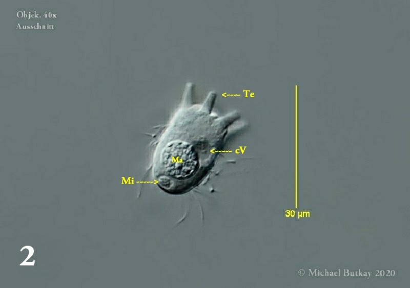 Bild 2. Der Parasit hat eine Länge von 28µm; Ma= Makronucleus, Mi= Mikronucleus, Te= dicke Tentakel, cV= Kontraktile Vakuole