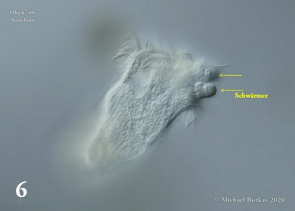 Als ich dann einen Stentor roeseli entdeckt habe Abb. 6, konnte ich an seinem Peristom 5 dieser Parasiten, angeheftet sehen. Der Stentor, hat verzweifelt ein Eindringen zu verhindern und durch ,,kräftige Bewegungen" versucht, diese los zu werden. In der Literatur wird der parasitäre Schwärmer in S. roeseli als Sphaerophrya stentoris zitiert.