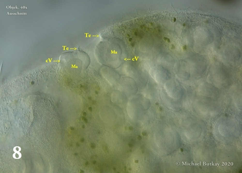 auf einem Aufzuchtdeckglas habe ich folgende Entdeckung gemacht. Im ersten Moment, als ich diese Viecher sah, dachte ich an eine Mondlandekapsel im Anflug, Abb.1. Bei genauerer Betrachtung erinnerten sie mich an Schwärmer von Sauginfusorien, also Parasiten. In der Probe konnten an die 10 Stück, mit dem Gleichen sackförmigen Aussehen gefunden werden, Länge zw. 22 und 30 µm, Abb. 3. Der Körper war mit 3 weit auseinander gestellten Cilienreihen (Ci) umstellt, Abb.4. Das Hinterende des Schwärmers war, wenn ich mich nicht verzählt habe, mit 8 bis 10, ich nenne sie mal Saugnäpfe, nicht gekopfte Tentakeln (Te), wie bei Sphaerophrya stentoris, umstellt, Abb. 1,2,5. In der Mitte befand sich ein großer, runder Makronucleus (Ma) und ein kleiner Mikronucleus (Mi). Am Rand 1 kontraktile Vakuole (cV), Abb.2.