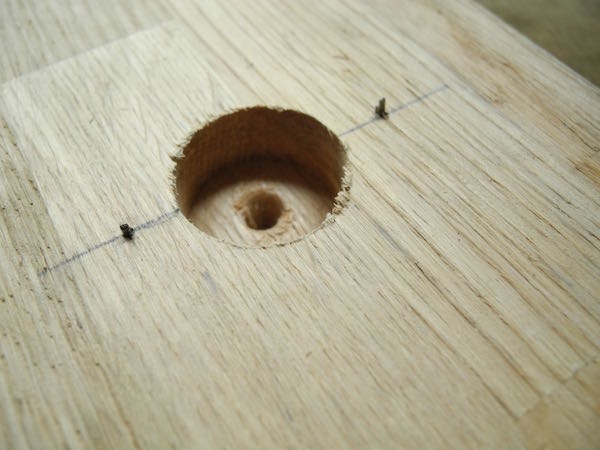 Ein großes Loch in ein (Hart-)Holzbrett, zwei Stahlstifte links und rechts davon und schon kann man mit ziemlich großer Kraft das Gewinde, das den Schlitten hält aufdrehn.