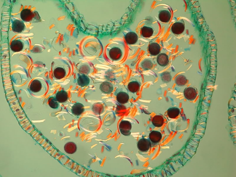 ich hatte noch 2 Bilder vergessen: Sporen mit "gehäxelten" Hapteren im Längsschnitt durch so einen Sporen"Stand" und im gleichen Schnitt ein Längsschnitt durch ein Gefäßbündel. Offensichtlich beides aus Zellulose, weil kräftig doppelbrechend.