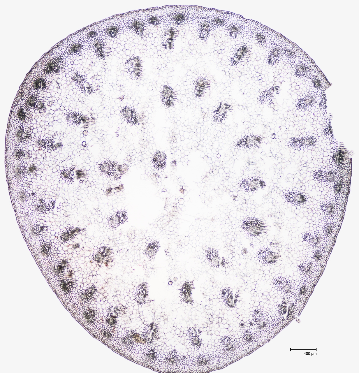 Die Anatomie der Sprosse ist bei den Monokotyledonen immer mehr oder weniger gleichartig: Die geschlossen kollateralen Leitbündel liegen über den gesammten Querschnitt im Mark verstreut und ggf. gibt es zum Aussenrand hin einen Ring kleinerer und dicht beieinander stehender Bündel. Die Ähnlichkeit besteht also nicht nur innerhalb der Familie der Aronstabgewächse.