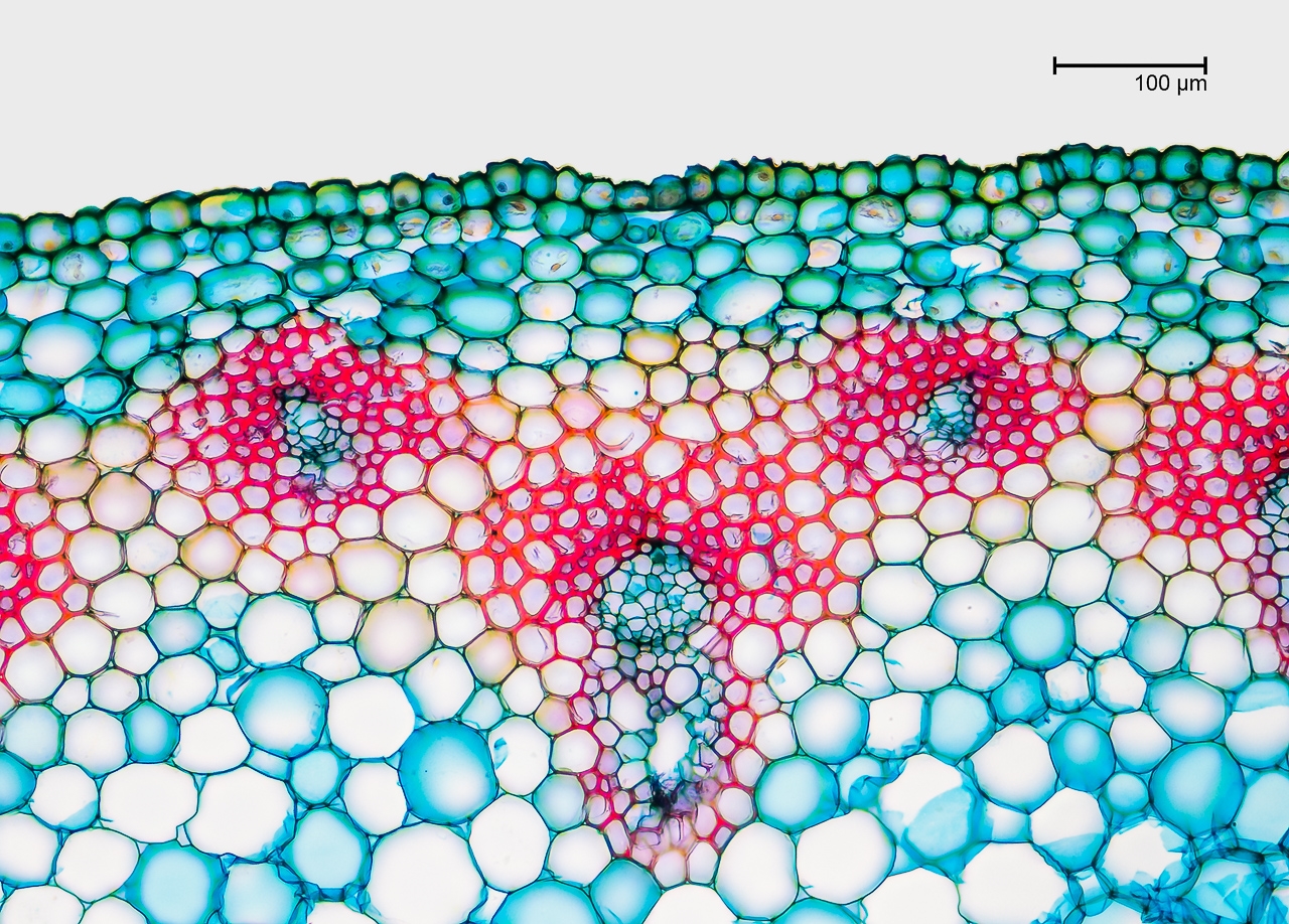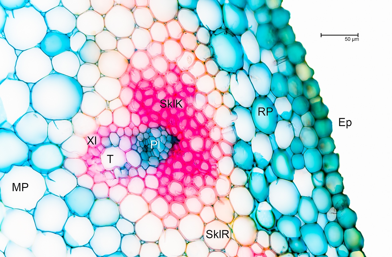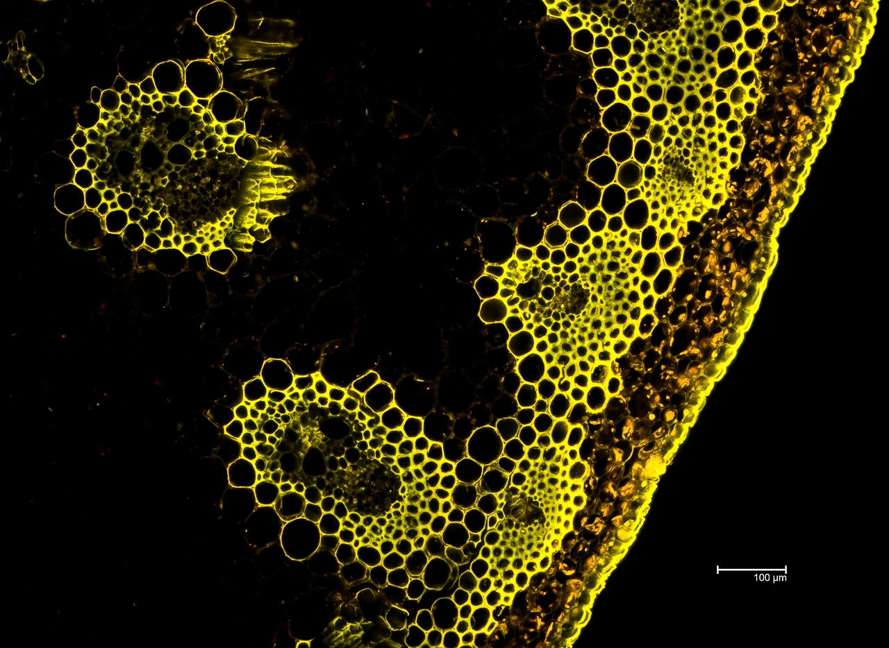 Die letzten Aufnahmen zeigen bei verschiedenen Vergrößerungen Details der Leitbündel, wobei erneut die Tüpfel der Tracheen sehr schön zu erkennen sind.